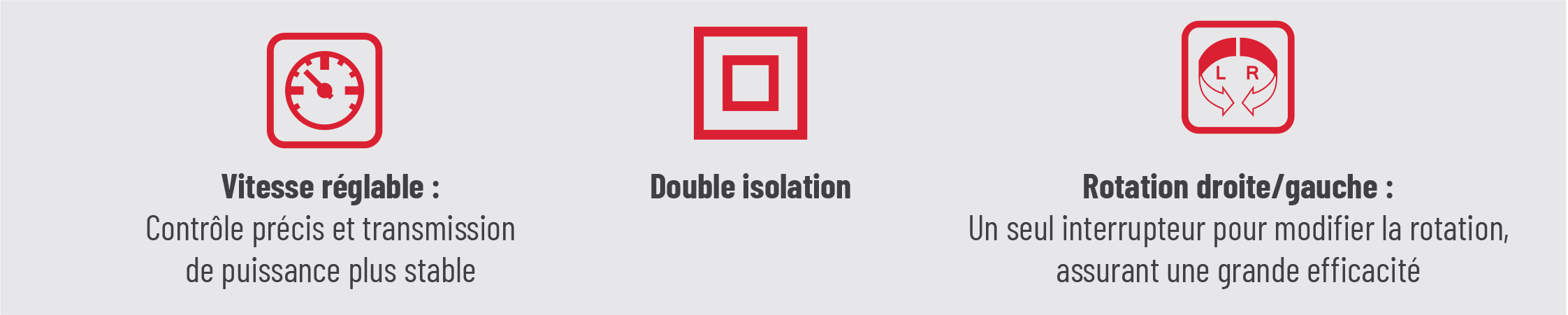- Sécurité d’utilisation : La double isolation assure une utilisation fiable et sécurisée, même dans des conditions de travail exigeantes.