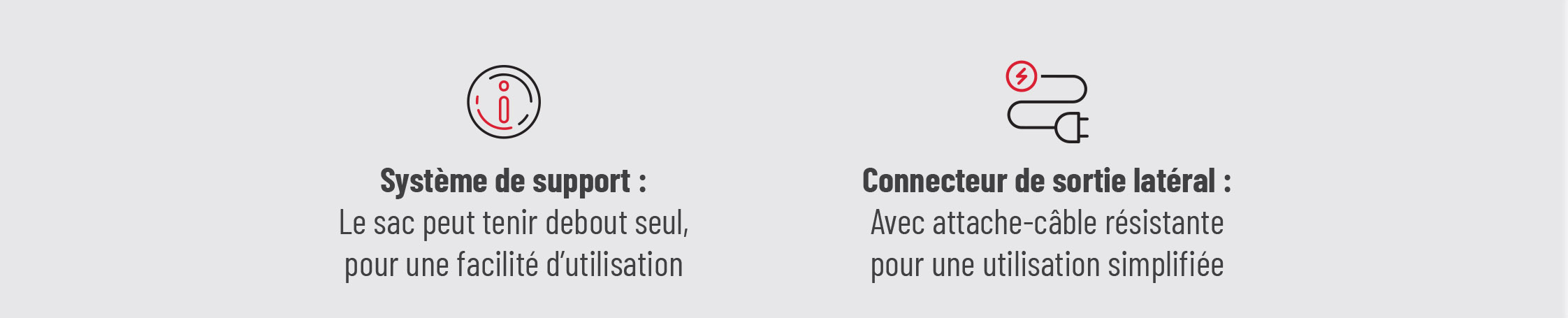 - Stabilité accrue : système autoportant permettant au sac de tenir debout seul
