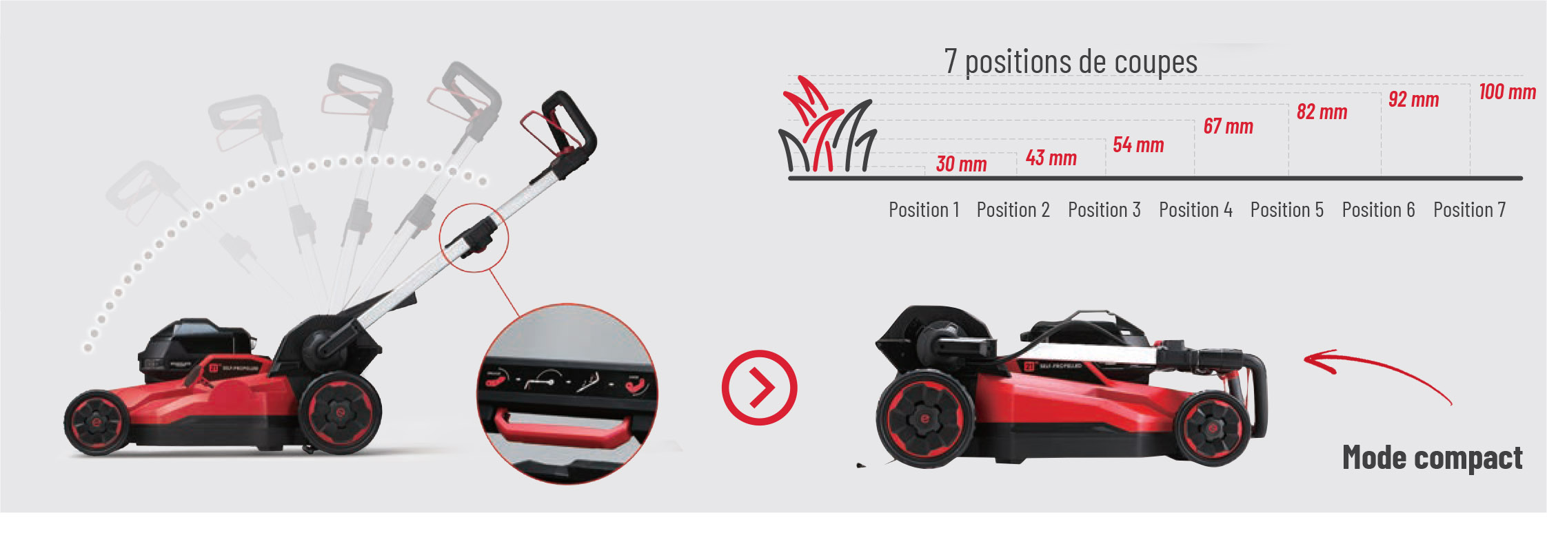- Réglage centralisé de la hauteur de coupe sur 7 positions de 30 à 100 mm pour s’adapter à tous les types de gazon